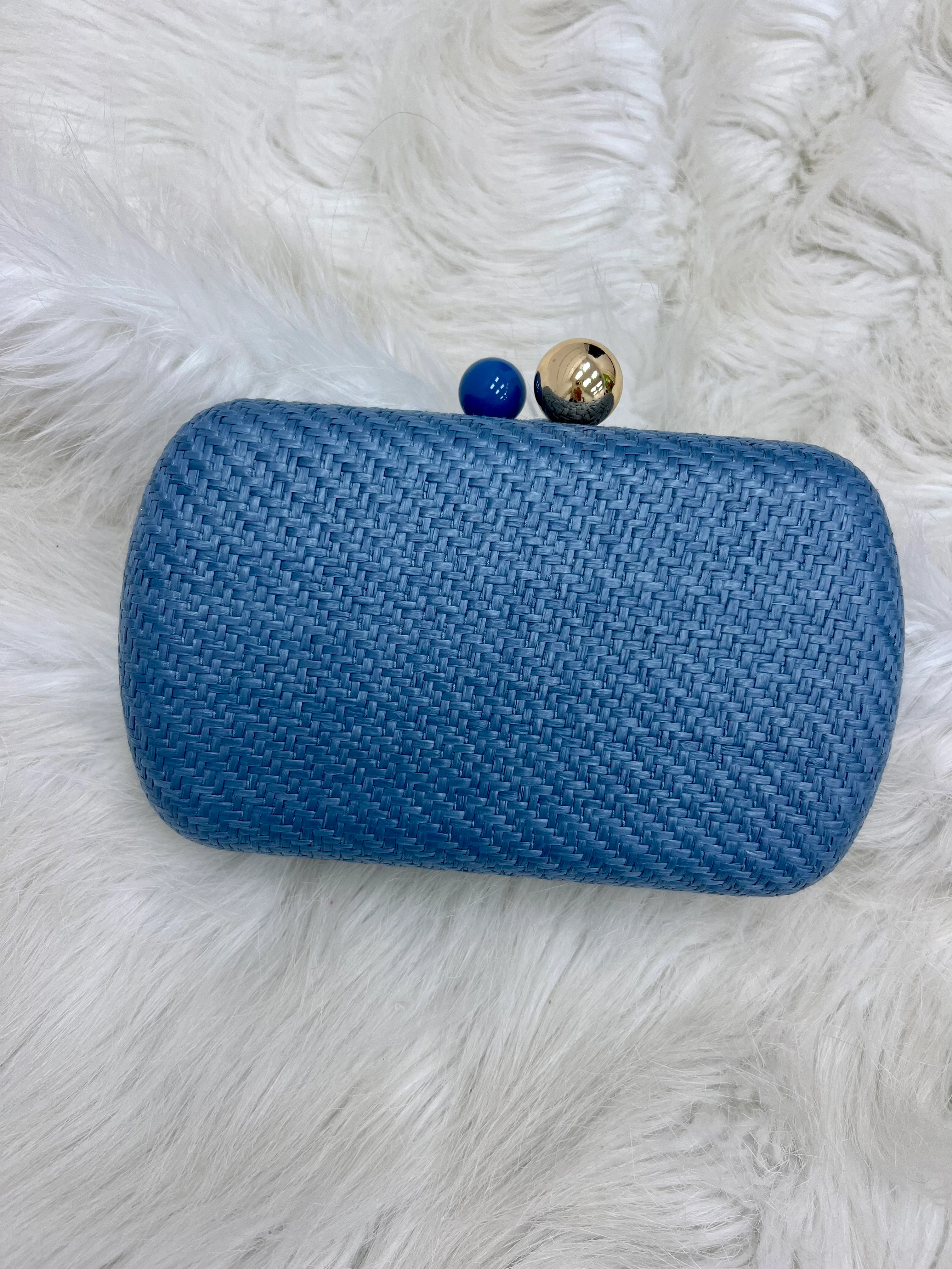Meet your new favorite clutch, our cheerful, Carmen Clutch! This hard, oval shaped clutch is made from a sturdy woven material in either blue, green, beige or pink with one gold and one colored ball on top, used as a secure push lock closure. With its dainty detachable cross-body chain, you can opt to wear it hands-free, adding some extra versatility to your style. This bag is sure to compliment your unique look!