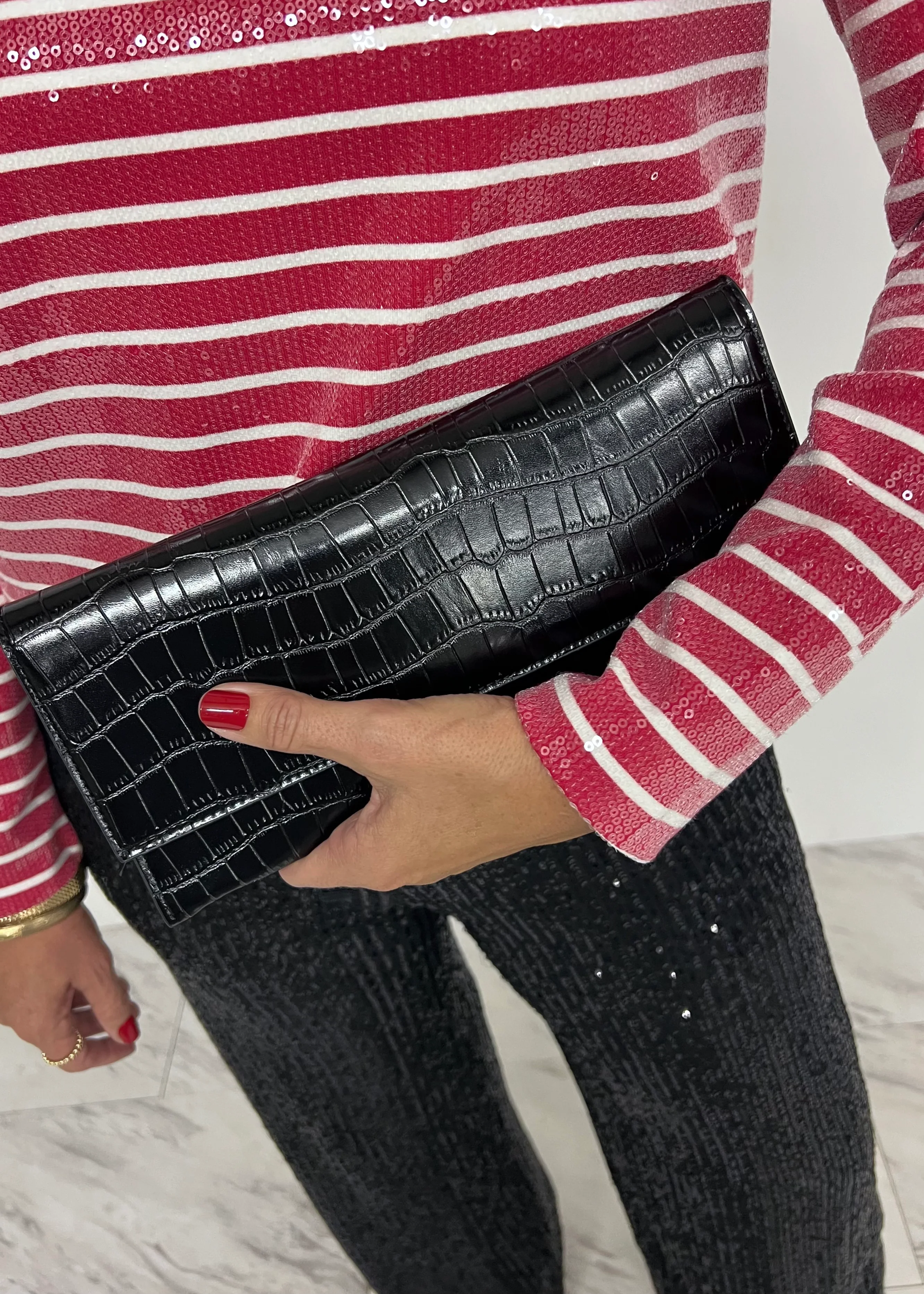 Meet your new go-to clutch, designed for maximum chicness with minimal fuss! This vegan leather beauty features a luxe croc print and an envelope flap for that classic touch. The gold hardware and detachable chain strap make it effortlessly versatile—switch between a sleek handheld clutch or a glamorous crossbody in seconds. Inside, you’ll find a handy zip pocket lined in fab fabric. Perfect for keeping your essentials stylishly in check