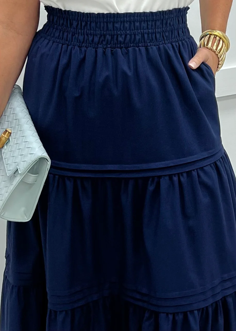 Change up your look by adding our Miller Skirt into your wardrobe mix! This navy blue beauty is perfect for warm weather, with its tiered silhouette, side slit pockets, smocked waistband, midi length and flattering design - perfect for tucking in your favorite tees and tanks! Let this chic skirt be the star of your look! Model is 5'8'' and wearing a size small.