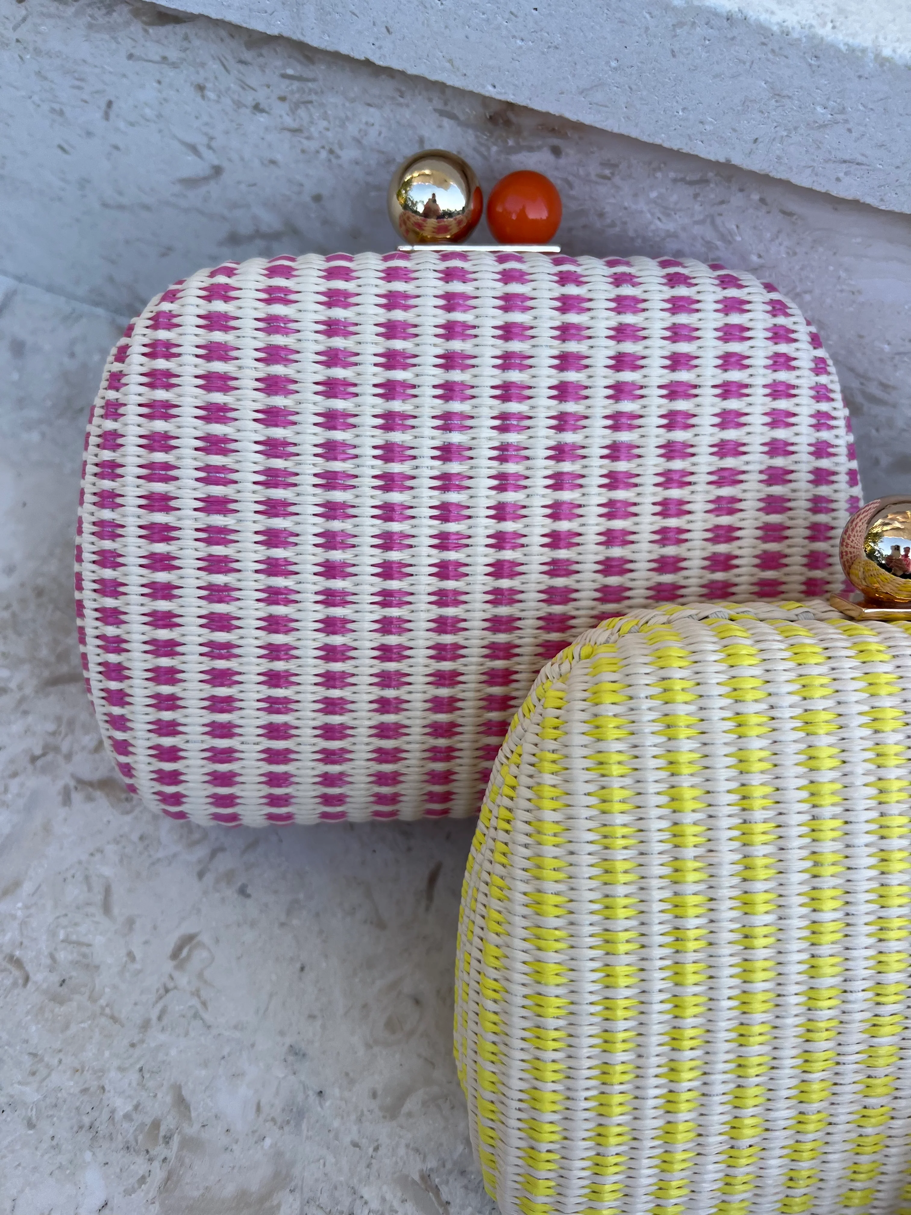 Turn heads with our Rebel Clutch, the ultimate pop of color for your warm weather wardrobe. This structured clutch features a vibrant woven body and eye-catching double orb magnetic frame closure. The detachable gold chain adds versatility, so you can wear it crossbody or carry it as a statement piece. Compact yet chic, it’s the perfect companion for everything from beachside cocktails to rooftop soirées.