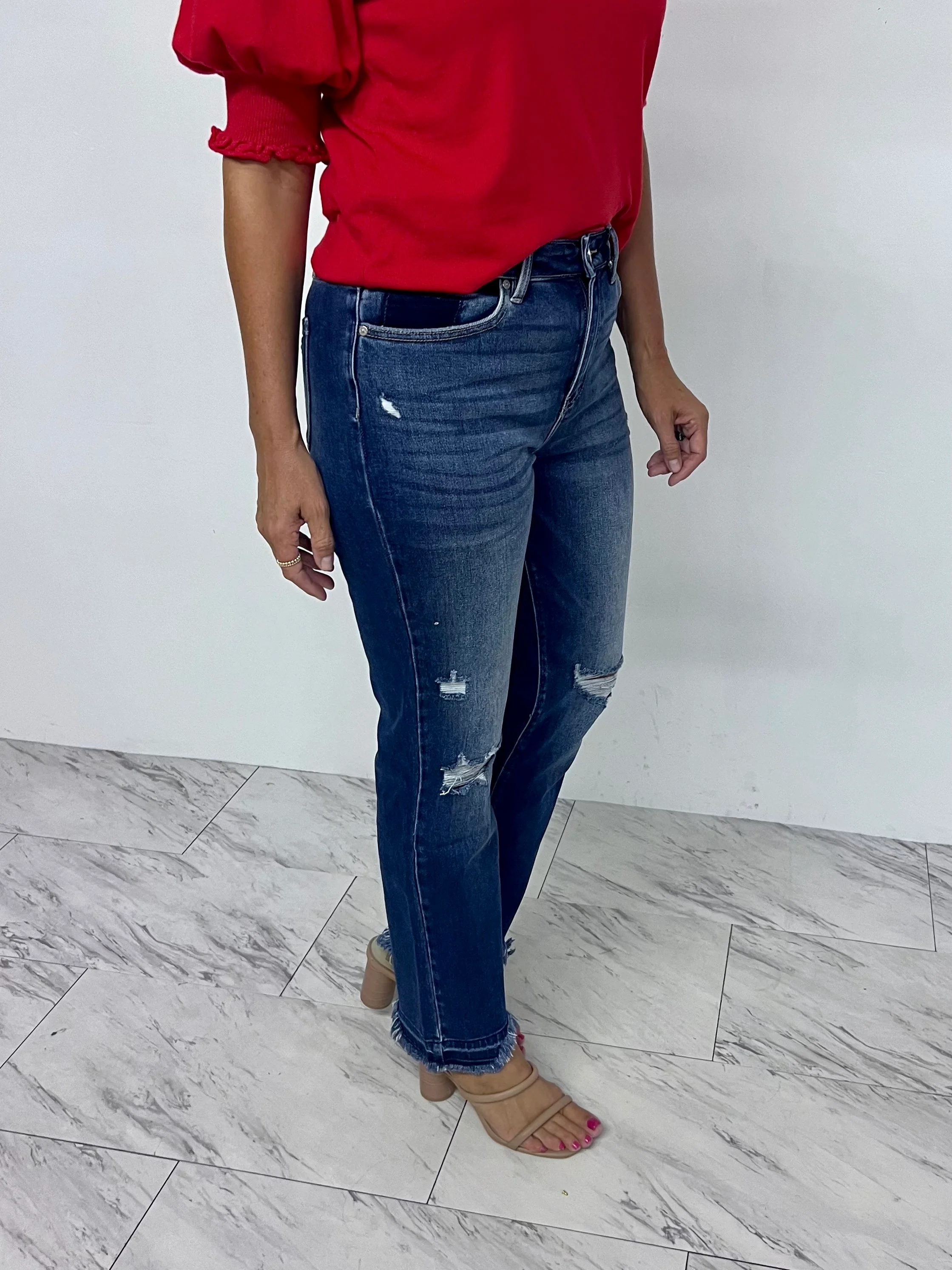 Your wardrobe needs a great pair of distressed denim and our Serena style is the perfect choice! Medium weight, medium wash denim with stretch shapes this slim + straight leg style with a high waist, traditional denim pockets and distressing along the hemline + knees. Wear this style day or night! Model is 5'8'' and wearing a size 27.