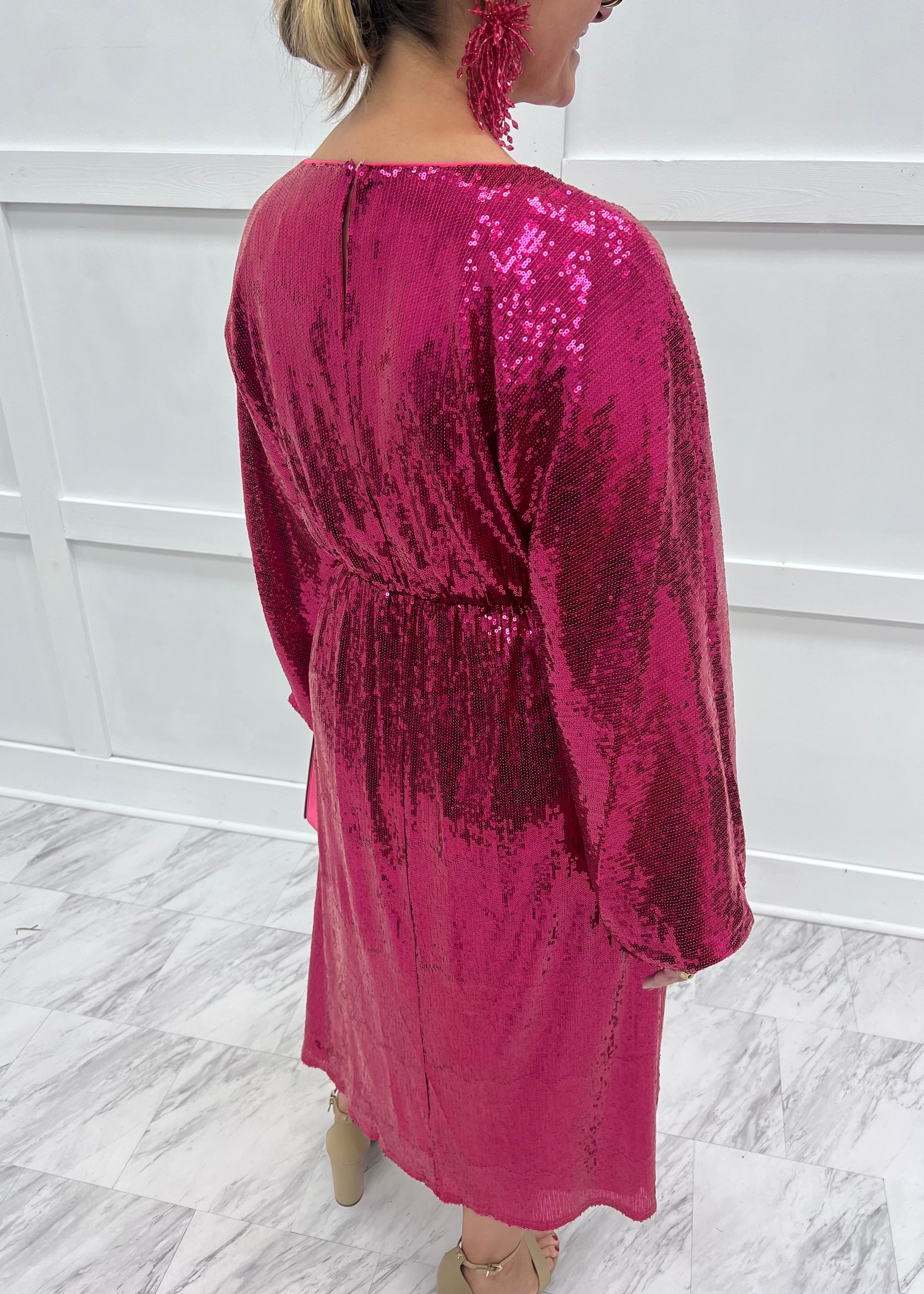 Look seriously stunning in this head turning dress! Fuchsia colored sequin fabric shapes this dress featuring a round neckline, long dolman sleeves that are elasticized at the wrists, a fitted waistline that is elasticized in the back, and a midi length. The back has a small keyhole + button closure at the neckline. You can't go wrong with this little dress! Pair with sassy heels and a chic clutch and you will be ready for a fun night out! Model is 5'8'' and wearing a size small.