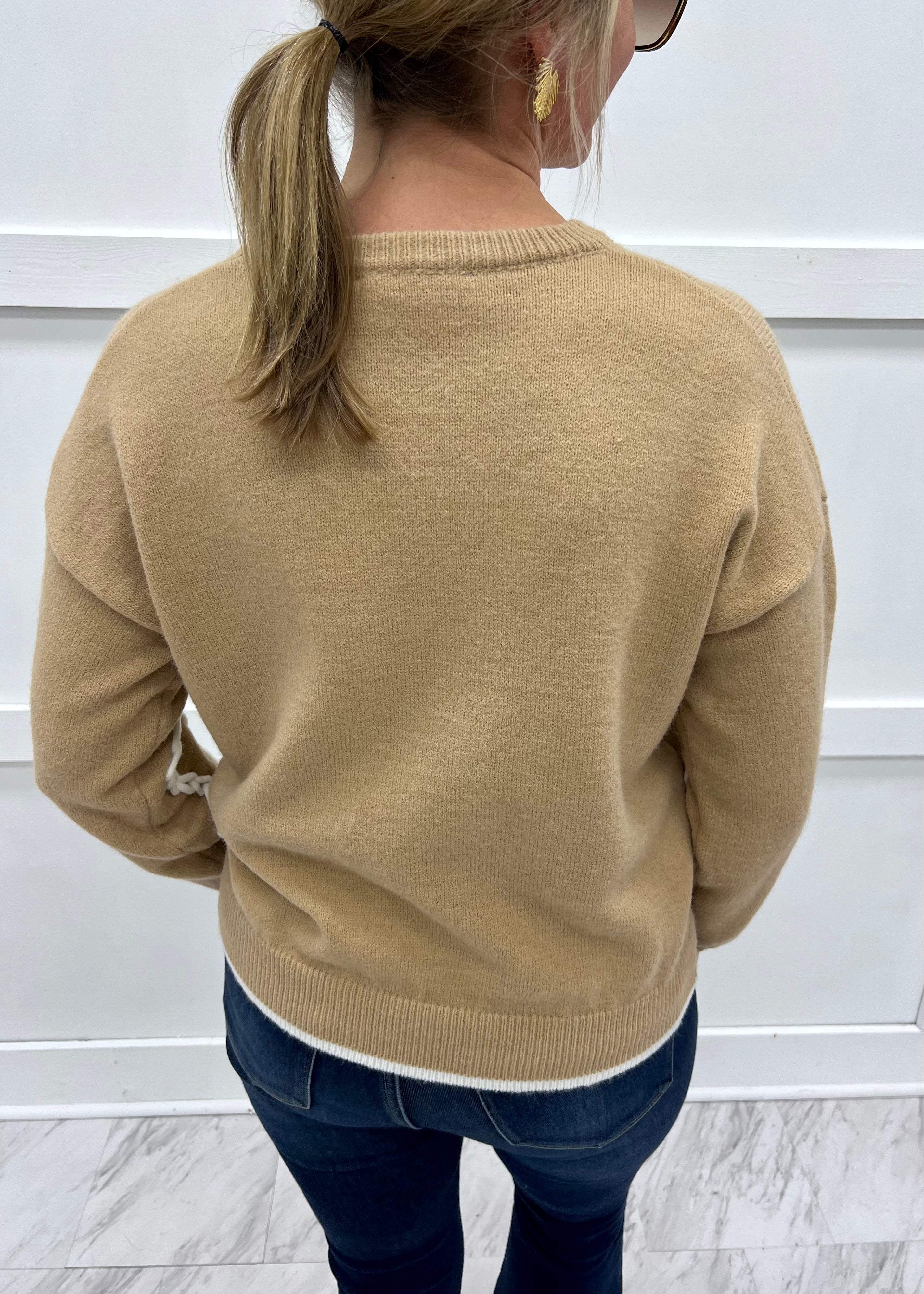 We love a good sweater and this classic style does not disappoint! Medium weight camel colored sweater knit fabric with an ivory textured chain design shapes this sweater featuring a round neckline, long sleeves and a looser fit. We love this one tucked into denim or trousers for a fun, on trend preppy look! Model is 5'8'' and wearing a size small.